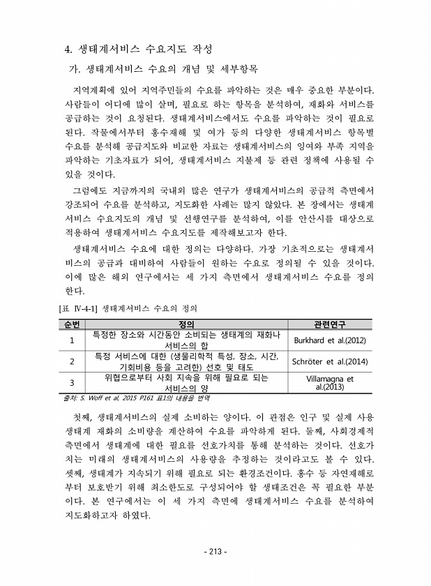 4. 생태계서비스 수요지도 작성 가. 생태계서비스 수요의 개념 및 세부항목 지역계획에 있어 지역주민들의 수요를 파악하는 것은 매우 중요한 부분이다. 사람들이 어디에 많이 살며, 필요로 하는 항목을 분석하여, 재화와 서비스를 공급하는 것이 요청된다. 생태계서비스에서도 수요를 파악하는 것이 필요로 된다. 작물에서부터 홍수재해 및 여가 등의 다양한 생태계서비스 항목별 수요를 분석해 공급지도와 비교한 자료는 생태계서비스의 잉여와 부족 지역을 파악하는 기초자료가 되어, 생태계서비스 지불제 등 관련 정책에 사용될 수 있을 것이다. 그럼에도 지금까지의 국내외 많은 연구가 생태계서비스의 공급적 측면에서 강조되어 수요를 분석하고, 지도화한 사례는 많지 않았다. 본 장에서는 생태계 서비스 수요지도의 개념 및 선행연구를 분석하...
