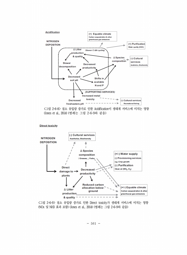 561 그림 2-6-8 질소 유입량 증가로 인한 Acidification이 생태계 서비스에 미치는 영향 Jones et al., 2014 범례는 그림 2-6-9와 같음 그림 2-6-9 질소 유입량 증가로 인한 Direct toxicity가 생태계 서비스에 미치는 영향 NOx 및 NH3 효과 포함 Jones et al., 2014 범례는 그림 2-6-9와 같음