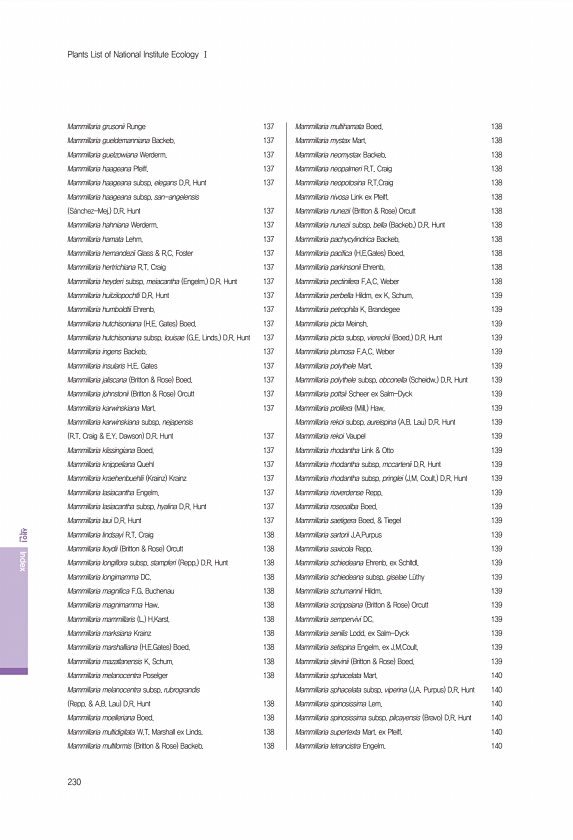 230 색인 Index Plants List of National Institute Ecology Ⅰ Mammillaria grusonii Runge 137 Mammillaria gueldemanniana Backeb. 137 Mammillaria guelzowiana Werderm. 137 Mammillaria haageana Pfeiff. 137 Mammillaria haageana subsp. elegans D.R. Hunt 137 Mammillaria haageana subsp. san-angelensis S?nchez-Mej. D.R. Hunt 137 Mammillaria hahniana Werderm. 137 Mammillaria hamata Lehm. 137 Mammillaria hernande...