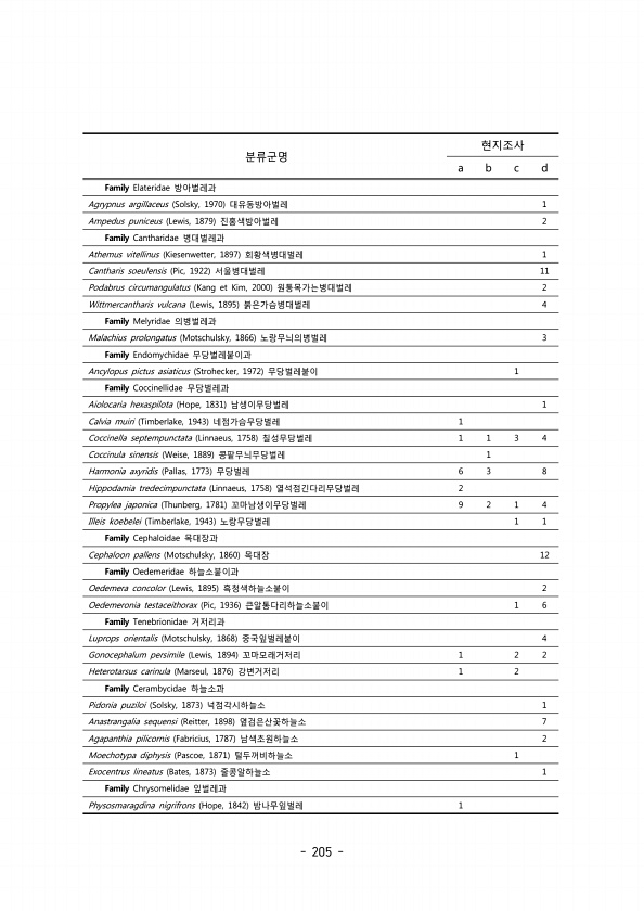205 분류군명 현지조사 a b c d Family Elateridae 방아벌레과 Agrypnus argillaceus Solsky, 1970 대유동방아벌레 1 Ampedus puniceus Lewis, 1879 진홍색방아벌레 2 Family Cantharidae 병대벌레과 Athemus vitellinus Kiesenwetter, 1897 회황색병대벌레 1 Cantharis soeulensis Pic, 1922 서울병대벌레 11 Podabrus circumangulatus Kang et Kim, 2000 원통목가는병대벌레 2 Wittmercantharis vulcana Lewis, 1895 붉은가슴병대벌레 4 Family Melyridae 의...