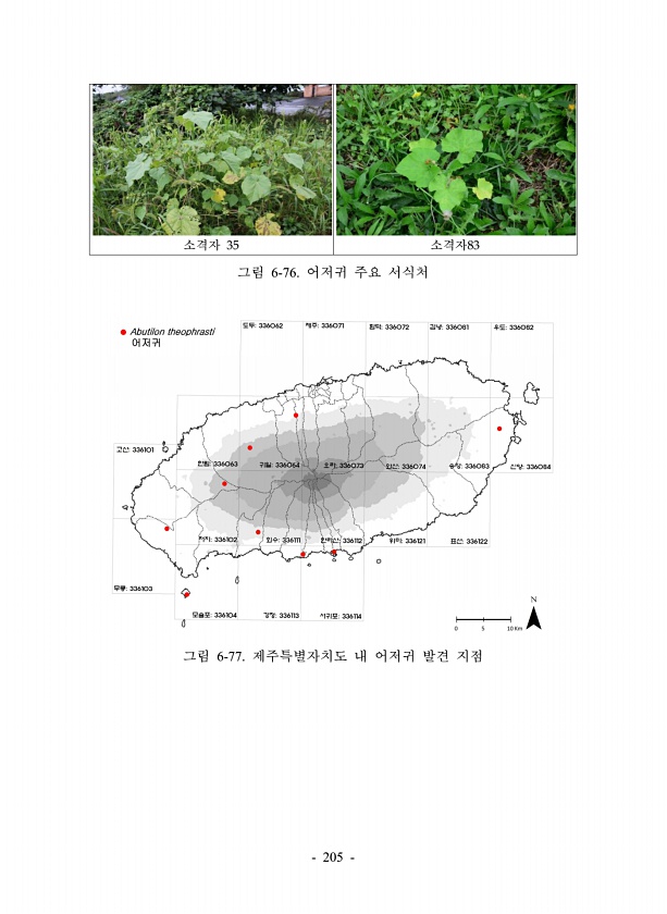 205 소격자 35 소격자83 그림 6-76. 어저귀 주요 서식처 그림 6-77. 제주특별자치도 내 어저귀 발견지점