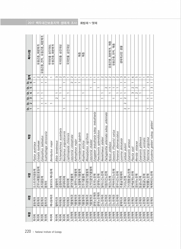 220 목명 과명 국명 학명 St. 1 St. 2 St. 3 St. 4 St. 5 St. 6 합계 특이사항 파리목 꽃등에과 오스트리아꽃등에 Pipiza austriaca 1 1 파리목 꽃등에과 큰무늬배짧은꽃등에 Eristalis kyokoae 1 1 2 유용곤충_화분매개 파리목 꽃등에과 호리꽃등에 Episyrphus balteatus 1 1 1 1 4 유용곤충_천적, 유용곤충_화분매개 파리목 똥파리과 똥파리 Scathophaga stercoraria 1 1 2 파리목 재니등에과 빌로오도재니등에 Bombylius major 1 1 국외반출 승인대상, 유용곤충_화분매개 파리목 털파리과 검털파리 Bibio tenebrosus 2 1 3 파리목 파리매과 검정파리매 Trichomachimus scutellaris 1...