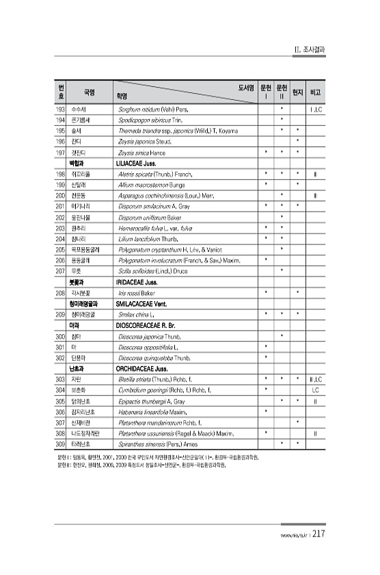 II. 조사결과 www.nie.re.kr ?217 번 호 국명 도서명 학명 문헌 Ⅰ 문헌 Ⅱ 현지 비고 193 수수새 Sorghum nitidum Vahl Pers. * Ⅰ,LC 194 큰기름새 Spodiopogon sibiricus Trin. * 195 솔새 Themeda triandra ssp. japonica Willd. T. Koyama * * 196 잔디 Zoysia japonica Steud. * 197 갯잔디 Zoysia sinica Hance * * * 백합과 LILIACEAE Juss. 198 쥐꼬리풀 Aletris spicata Thunb. Franch. * * * Ⅲ 199 산달래 Allium macrostemon Bunge * * 200 천문동 Asparagus cochinchinens...