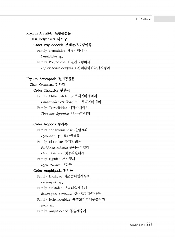 Ⅱ. 조사결과 www.nie.re.kr ? 221 Phylum Annelida 환형동물문 Class Polychaeta 다모강 Order Phyllodocida 부채발갯지렁이목 Family Nereididae 참갯지렁이과 Nereididae sp. Family Polynoidae 비늘갯지렁이과 Lepidonotus elongatus 긴예쁜이비늘갯지렁이 Phylum Arthropoda 절지동물문 Class Crustacea 갑각강 Order Thoracica 완흉목 Family Chthamalidae 조무래기따개비과 Chthamalus challengeri 조무래기따개비 Family Tetraclitidae 사각따개비과 Tetraclita japonica 검은큰따개비 Order Isopoda 등각목 Famil...
