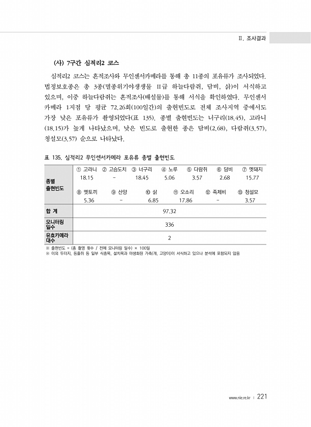 Ⅱ. 조사결과 www.nie.re.kr ? 221 사 7구간 심적리2 코스 심적리2 코스는 흔적조사와 무인센서카메라를 통해 총 11종의 포유류가 조사되었다. 법정보호종은 총 3종 멸종위기야생생물 Ⅱ급 하늘다람쥐, 담비, 삵 이 서식하고 있으며, 이중 하늘다람쥐는 흔적조사 배설물 를 통해 서식을 확인하였다. 무인센서 카메라 1지점 당 평균 72.26회 100일간 의 출현빈도로 전체 조사지역 중에서도 가장 낮은 포유류가 촬영되었다 표 135 종별 출현빈도는 너구리 18.45 , 고라니 18.15 가 높게 나타났으며, 낮은 빈도로 출현한 종은 담비 2.68 , 다람쥐 3.57 , 청설모 3.57 순으로 나타났다. 종별 출현빈도 ① 고라니 ② 고슴도치 ③ 너구리 ④ 노루 ⑤ 다람쥐 ⑥ 담비 ⑦ 멧돼지 18.15 1...
