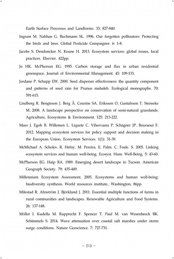 213 Earth Surface Processes and Landforms. 33827-840. Ingram M. Nabhan G. Buchmann SL. 1996. Our forgotten pollinatorsProtecting the birds and bees. Global Pesticide Campaigner. 61-8. Jacobs S. Dendoncker N. Keune H. 2013. Ecosystem servicesglobal issues, local practices. Elsevier. 422pp. Jo HK. McPherson EG. 1995. Carbon storage and flux in urban residential greenspace. Journal of Environmental M...