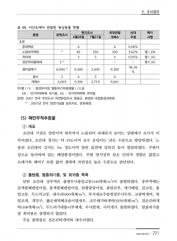 Ⅱ. 조사결과 www.nie.re.kr ? 221 표 69. 사산도에서 관찰된 육상동물 현황 종명 문헌조사 현지조사 최대관찰 개체수 상대 우점 특이 4월28일 7월21일 사항 조류 중대백로 6 6 0.06% 노랑부리백로 * 85 350 350 3.62% 멸Ⅰ,EN 저어새 5 3 5 0.05% 멸Ⅰ,VU 검은머리물떼새 3 * 멸Ⅱ,VU 괭이갈매기 6,000 * 9,300 2,400 9,300 96.26 % 종수 2 4 3 4 개체수 6,003 9,396 2,753 9,661 주 멸Ⅰ/Ⅱ 환경부지정 멸종위기야생생물Ⅰ/Ⅱ급 EN 국가적색목록 위기종, VU 국가적색목록 취약종 문헌 2007 전국 무인도서 자연환경조사 영광군. 환경부·국립환경과학원 * 2007년 전국 천연기념물 분포지도....