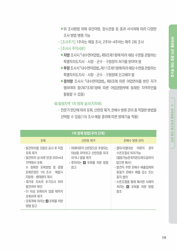 19 외래생물 관리 종합 대응 매뉴얼 Ⅱ. 외래생물 분류군별 대응 방안 위 조사방법 외에 유인어망, 잠수관찰 등 종과 서식처에 따라 다양한 조사 방법 병행 가능 [조사주기] 1주차는 매일 조사, 2주차4주차는 매주 2회 조사 [조사시 주의사항] 자망 조사시 「내수면어업법」 제9조제1항에 따라 해당 수면을 관할하는 특별자치도지사ㆍ시장ㆍ군수ㆍ구청장의 허가를 받아야 함 투망 조사시 「내수면어업법」 제11조제1항에 따라 해당 수면을 관할하는 특별자치도지사ㆍ시장ㆍ군수ㆍ구청장에 신고해야 함 정치망 조사시 「내수면어업법」 제6조에 따른 어업면허를 받은 자가 행하여야 함 제7조제1항에 따른 어업권원부에 등재된 지역주민을 활용할 수 있음 발생지역 1차 방제 실시 지자체 전문가 판단에 따라 포획, 산란장 제거, 온배수 방류 ...
