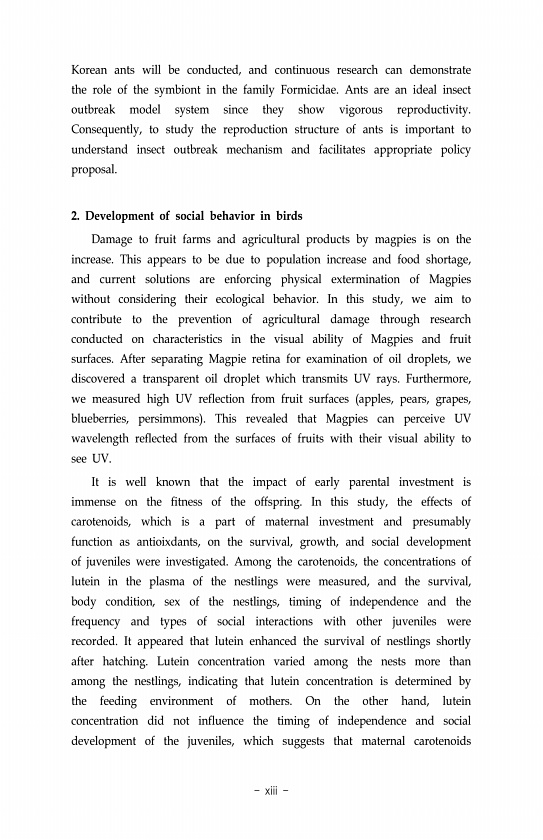 Korean ants will be conducted, and continuous research can demonstrate the role of the symbiont in the family Formicidae. Ants are an ideal insect outbreak model system since they show vigorous reproductivity. Consequently, to study the reproduction structure of ants is important to understand insect outbreak mechanism and facilitates appropriate policy proposal. 2. Development of social behavior ...