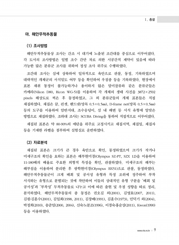 Ⅰ. 총괄 www.nie.re.kr ? 9 마. 해안무척추동물 1 조사방법 해안무척추동물상 조사는 간조 시 대기에 노출된 조간대를 중심으로 이루어졌다. 각 도서의 조사방법은 일별 조수 간만 차로 의한 시공간적 제약이 있음에 따라 가능한 많은 분류군 조사를 위하여 정성 조사 위주로 수행하였다. 조간대 조사는 섬에 상륙하여 일차적으로 육안으로 관찰, 동정, 기록하였으며 대략적인 개체군의 서식밀도 여부 등을 확인하여 우점종 등을 기록하였다. 현장에서 표본 채취 동정이 불가능하거나 용이하지 않은 말미잘류와 같은 분류군들은 카메라 Nikon D80, Ricon WG-5 를 이용하여 각 개체의 생태 사진을 3872×2592 pixels 해상도로 찍은 후 동정하였고, 그 외 분류군들의 개체 표본들은 직접 채집하였다. 채...