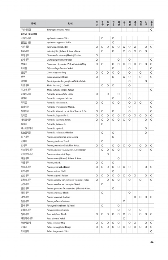 227 구실바위취 Saxifraga octopetala Nakai ○ 장미과 Rosaceae 산짚신나물 Agrimonia coreana Nakai ○ ○ 좀짚신나물 Agrimonia nipponica Koidz. ○ 짚신나물 Agrimonia pilosa Ledeb. ○ ○ ○ ○ ○ ○ ○ ○ ○ ○ 팥배나무 Aria alnifolia Siebold & Zucc. Decne. ○ ○ ○ ○ ○ ○ ○ 모과나무 Chaenomeles sinensis Thouin Koehne ○ 산사나무 Crataegus pinnatifda Bunge ○ ○ ○ ○ 뱀딸기 Duchesnea chrysantha Zoll. & Moritzi Miq. ○ ○ ○ ○ ○ ○ ○ ○ ○ ○ 터리풀 Filipendula glaberrim...