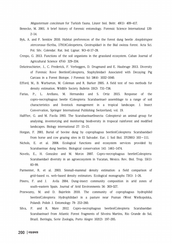 Megasternum concinnum for Turkish fauna. Linzer biol. Beitr. 40 1 409-417. Benecke, M. 2001. A brief history of forensic entomology. Forensic Science International 1202-14. Byk, A. and P. Semkiw 2010. Habitat preferences of the the forest dung beetle Anoplotrupes stercorosus Scriba, 1791 Coleopetera, Geotrupidae in the Bial owieza forest. Acta Sci. Pol. Silv. Colendar. Rat. Ind. Lignar. 9 3-4 17-2...