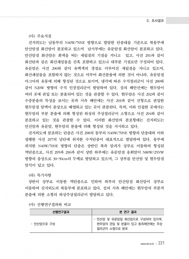 Ⅱ. 조사결과 www.nie.re.kr ? 221 다 주요지질 진지외도는 남동부의 N40W/70NE 방향으로 발달한 단층대를 기준으로 북동부에 안산암질 화산암이 분포하고 있으며 남서부에는 유문암질 화산암이 분포하고 있다. 안산암질 화산암은 회색을 띠는 세립질의 기질을 지니고 있고, 사진 291과 같이 화산탄과 같은 화산쇄설물을 간혹 포함하고 있으나 대부분 기질로만 구성되어 있다. 유문암은 사진 290와 같이 유백색의 경질로 이루어진 세립질을 지니고 있으며, 화산쇄설물을 포함하지 않는 것으로 미루어 화산분출에 의한 것이 아니라, 유문암질 마그마의 유동에 의해 형성된 것으로 보이며, 냉각에 따른 수직절리군이 사진 289와 같이 N20W 방향의 수직 인장절리군이 발달하여 있다. 섬의 해안선에는 현무암이 여러 곳에...