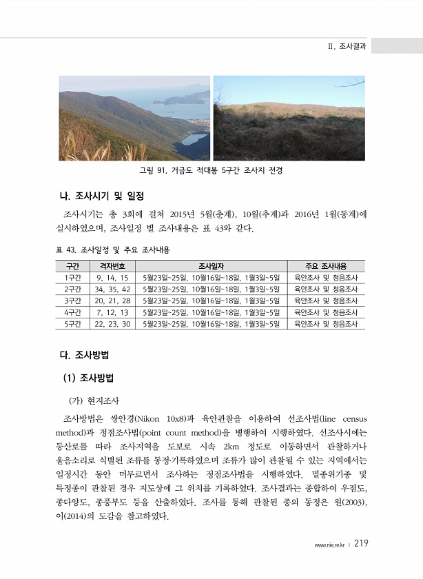 Ⅱ. 조사결과 www.nie.re.kr ? 219 그림 91. 거금도 적대봉 5구간 조사지 전경 나. 조사시기 및 일정 조사시기는 총 3회에 걸쳐 2015년 5월 춘계 , 10월 추계 과 2016년 1월 동계 에 실시하였으며, 조사일정 별 조사내용은 표 43와 같다. 구간 격자번호 조사일자 주요 조사내용 1구간 9, 14, 15 5월23일25일, 10월16일18일, 1월3일5일 육안조사 및 청음조사 2구간 34, 35, 42 5월23일25일, 10월16일18일, 1월3일5일 육안조사 및 청음조사 3구간 20, 21, 28 5월23일25일, 10월16일18일, 1월3일5일 육안조사 및 청음조사 4구간 7, 12, 13 5월23일25일, 10월16일18일, 1월3일5일 육안조사 및 청음조사 5구간 22, 23,...