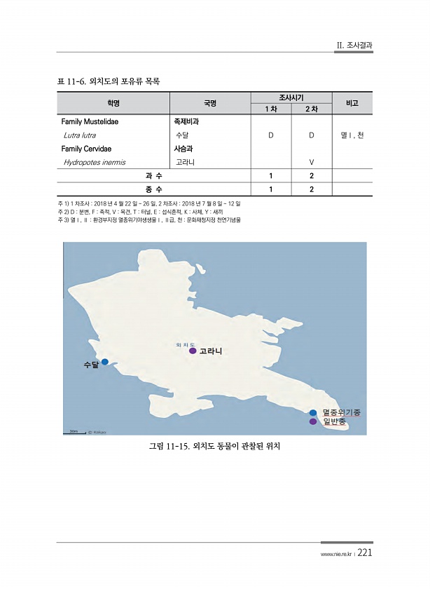 II. 조사결과 www.nie.re.kr ?221 학명 국명 조사시기 비고 1 차 2 차 Family Mustelidae 족제비과 Lutra lutra 수달 D D 멸Ⅰ, 천 Family Cervidae 사슴과 Hydropotes inermis 고라니 V 과 수 1 2 종 수 1 2 표 11-6. 외치도의 포유류 목록 주 1 1 차조사 2018 년 4 월 22 일 26 일, 2 차조사 2018 년 7 월 8 일 12 일 주 2 D 분변, F 족적, V 목견, T 터널, E 섭식흔적, K 사체, Y 새끼 주 3 멸Ⅰ, Ⅱ 환경부지정 멸종위기야생생물Ⅰ, Ⅱ급, 천 문화재청지정 천연기념물 그림 11-15. 외치도 동물이 관찰된위치