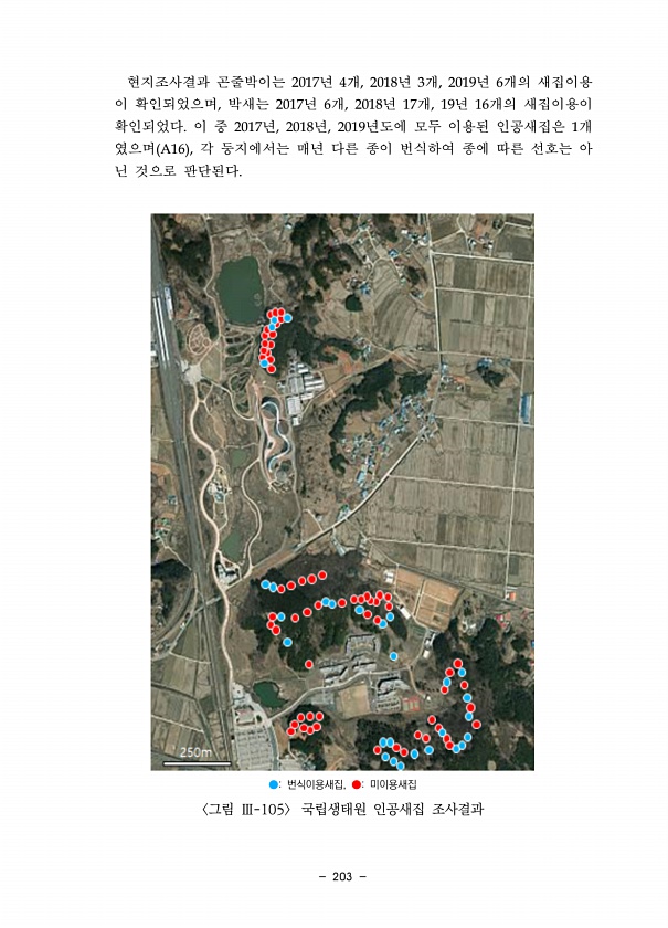 203 현지조사결과 곤줄박이는 2017년 4개, 2018년 3개, 2019년 6개의 새집이용 이 확인되었으며, 박새는 2017년 6개, 2018년 17개, 19년 16개의 새집이용이 확인되었다. 이 중 2017년, 2018년, 2019년도에 모두 이용된 인공새집은 1개 였으며 A16 , 각 둥지에서는 매년 다른 종이 번식하여 종에 따른 선호는 아 닌 것으로 판단된다. ●번식이용새집, ●미이용새집 그림 Ⅲ-105 국립생태원 인공새집조사결과