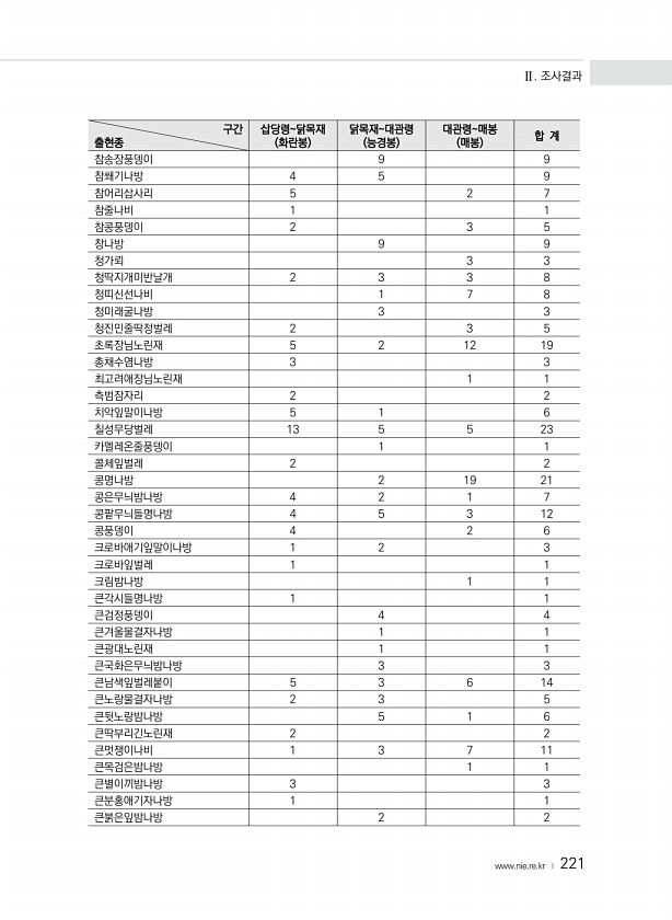 Ⅱ. 조사결과 www.nie.re.kr ? 221 구간 출현종 삽당령닭목재 화란봉 닭목재대관령 능경봉 대관령매봉 매봉 합 계 참송장풍뎅이 9 9 참쐐기나방 4 5 9 참어리삽사리 5 2 7 참줄나비 1 1 참콩풍뎅이 2 3 5 창나방 9 9 청가뢰 3 3 청딱지개미반날개 2 3 3 8 청띠신선나비 1 7 8 청미래굴나방 3 3 청진민줄딱정벌레 2 3 5 초록장님노린재 5 2 12 19 총채수염나방 3 3 최고려애장님노린재 1 1 측범잠자리 2 2 치악잎말이나방 5 1 6 칠성무당벌레 13 5 5 23 카멜레온줄풍뎅이 1 1 콜체잎벌레 2 2 콩명나방 2 19 21 콩은무늬밤나방 4 2 1 7 콩팥무늬들명나방 4 5 3 12 콩풍뎅이 4 2 6 크로바애기잎말이나방 1 2 3 크로바잎벌레 1 1 크림밤나방 1 ...