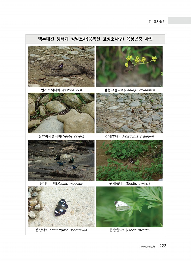 Ⅱ. 조사결과 www.nie.re.kr ? 223 백두대간 생태계 정밀조사 응복산 고정조사구 육상곤충 사진 번개오색나비 Apatura iris 뱀눈그늘나비 Lopinga deidamia 별박이세줄나비 Neptis pryeri 산네발나비 Polygonia c-album 산제비나비 Papilio maackii 왕세줄나비 Neptis alwina 은판나비 Mimathyma schrenckii 큰줄흰나비 Pieris melete