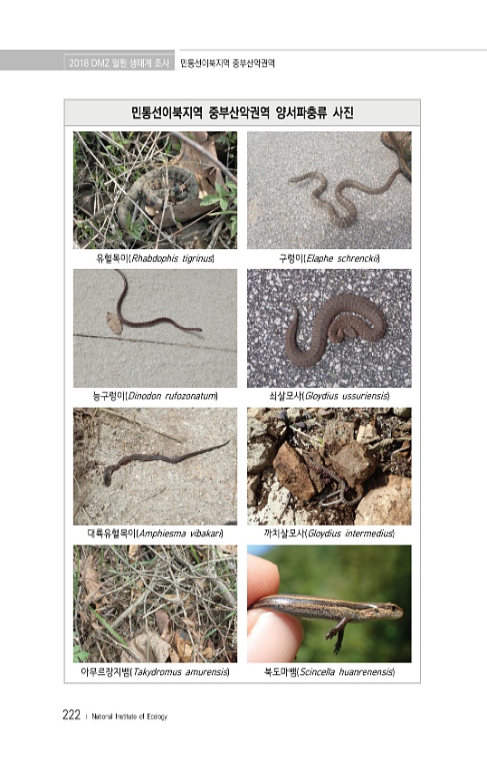 2018 DMZ 일원 생태계 조사 민통선이북지역 중부산악권역 222 ? National Institute of Ecology 민통선이북지역 중부산악권역 양서파충류 사진 유혈목이 Rhabdophis tigrinus 구렁이 Elaphe schrenckii 능구렁이 Dinodon rufozonatum 쇠살모사 Gloydius ussuriensis 대륙유혈목이 Amphiesma vibakari 까치살모사 Gloydius intermedius 아무르장지뱀 Takydromus amurensis 북도마뱀 Scincella huanrenensis