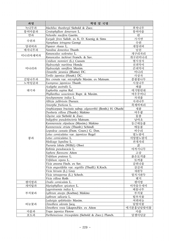 2018 전국해안사구 자연환경조사 충남 220 ? National Institute of Ecology 번호 학명 국명 해빈 배후습지 배후농경지 배후삼림 비고 Family Theaceae 차나무과 41 Camellia japonica L. 동백나무 ● Ⅰ Family Cucurbitaceae 박과 42 Sicyos angulatus Miq. Kitam. 가시박 ● 외, 생교 43 Trichosanthes kirilowii Maxim. 하늘타리 ● Family Salicaceae 버드나무과 44 Populus euramericana Guinier 이태리포푸라 ● ● 45 Populus nigra var. italica Koehne 양버들 ● 46 Populus x tomentiglandulosa T. B. L...