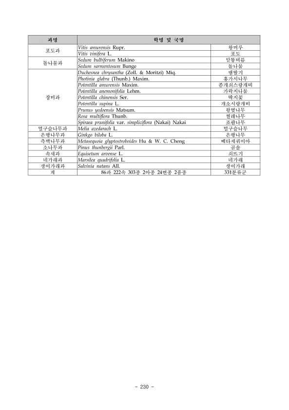 2018 전국해안사구 자연환경조사 충남 220 ? National Institute of Ecology 번호 학명 국명 해빈 배후습지 배후농경지 배후삼림 비고 Family Theaceae 차나무과 41 Camellia japonica L. 동백나무 ● Ⅰ Family Cucurbitaceae 박과 42 Sicyos angulatus Miq. Kitam. 가시박 ● 외, 생교 43 Trichosanthes kirilowii Maxim. 하늘타리 ● Family Salicaceae 버드나무과 44 Populus euramericana Guinier 이태리포푸라 ● ● 45 Populus nigra var. italica Koehne 양버들 ● 46 Populus x tomentiglandulosa T. B. L...