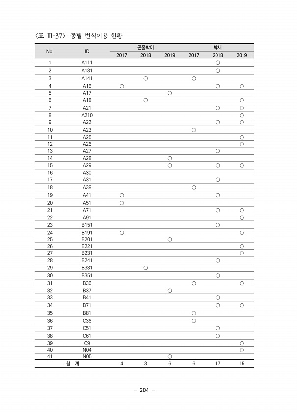 204 No. ID 곤줄박이 박새 2017 2018 2019 2017 2018 2019 1 A111 ○ 2 A131 ○ 3 A141 ○ ○ 4 A16 ○ ○ ○ 5 A17 ○ 6 A18 ○ ○ 7 A21 ○ ○ 8 A210 ○ 9 A22 ○ ○ 10 A23 ○ 11 A25 ○ 12 A26 ○ 13 A27 ○ 14 A28 ○ 15 A29 ○ ○ ○ 16 A30 17 A31 ○ 18 A38 ○ 19 A41 ○ ○ 20 A51 ○ 21 A71 ○ ○ 22 A91 ○ 23 B151 ○ 24 B191 ○ ○ 25 B201 ○ 26 B221 ○ 27 B231 ○ 28 B241 ○ 29 B331 ○ 30 B351 ○ 31 B36 ○ ○ 32 B37 ○ 33 B41 ○ 34 B71 ○ ○ 35 B81 ○ 36 C36 ○ ...