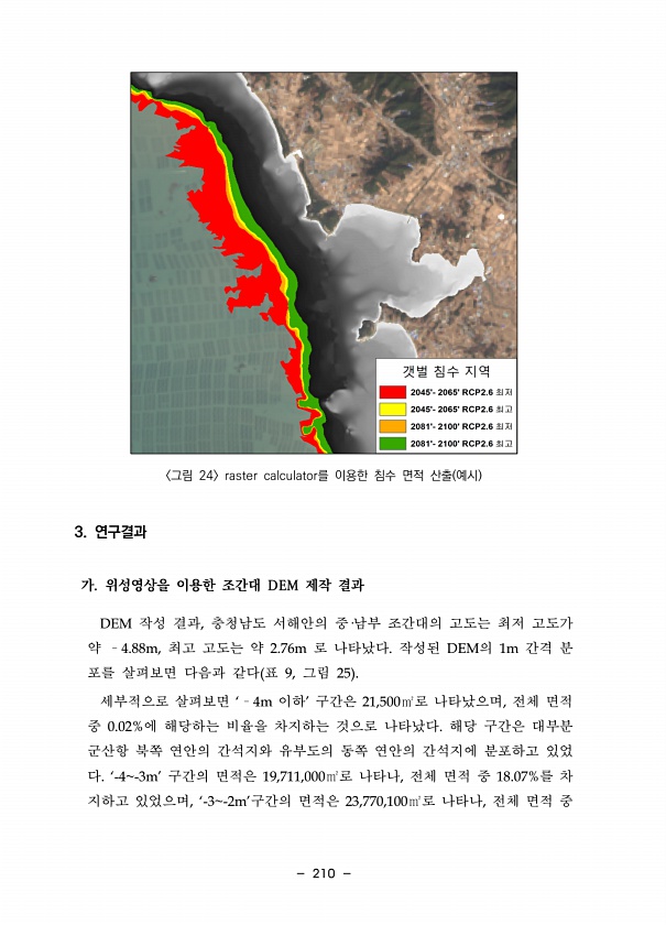 210 그림 24 raster calculator를 이용한 침수 면적 산출 예시 3. 연구결과 가. 위성영상을 이용한 조간대 DEM 제작 결과 DEM 작성 결과, 충청남도 서해안의 중·남부 조간대의 고도는 최저 고도가 약 ?4.88m, 최고 고도는 약 2.76m 로 나타났다. 작성된 DEM의 1m 간격 분 포를 살펴보면 다음과 같다 표 9, 그림 25 세부적으로 살펴보면 ‘?4m 이하’ 구간은 21,500㎡로 나타났으며, 전체 면적 중 0.02%에 해당하는 비율을 차지하는 것으로 나타났다. 해당 구간은 대부분 군산항 북쪽 연안의 간석지와 유부도의 동쪽 연안의 간석지에 분포하고 있었 다. ‘-4-3m’ 구간의 면적은 19,711,000㎡로 나타나, 전체 면적 중 18.07%를 차 지하고 있었으며, ‘-3-2m...