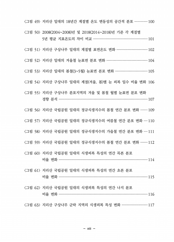 xiii 그림 49 지리산 일대의 18년간 계절별 온도 변동성의 공간적 분포 ··············100 그림 50 2008 20042008 년 및 2018 20142018 년 기준 각 계절별 5년 평균 지표온도의 차이 비교 ····························································101 그림 51 지리산 구상나무 일대의 계절별 표면온도 변화 ··································102 그림 52 지리산 일대의 겨울철 눈표면 분포 변화 ·············································104 그림 53 지리산 일대의 봄철 35월 눈표면 분포 변화 ·······························...