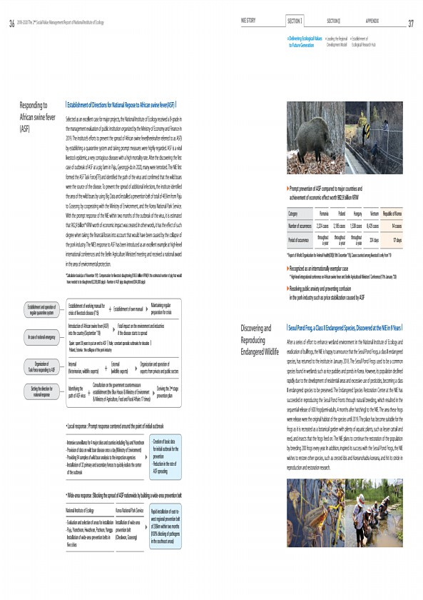 36 2018-2020 The 2nd Social Value Management Report of National Institute of Ecology NIE STORY SECTIONⅠ SECTIONⅡ APPENDIX 37 + Establishment of working manual for crisis of livestock disease ’15 Internal Veterinarian, wildlife experts External wildlife experts Organization and operation of experts from private and public sectors Introduction of African swine fever ASF into the country September ’1...