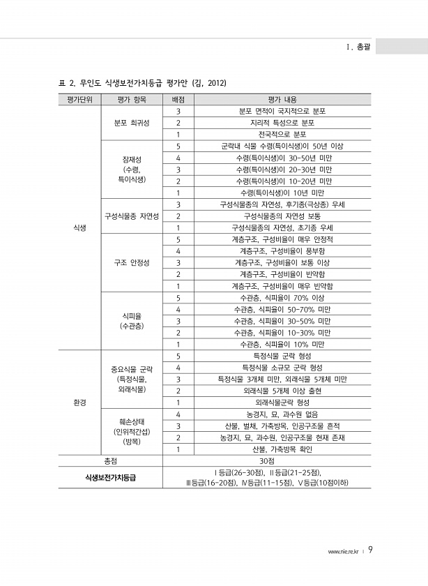 Ⅰ. 총괄 www.nie.re.kr ? 9 평가단위 평가 항목 배점 평가 내용 식생 분포 희귀성 3 분포 면적이 국지적으로 분포 2 지리적 특성으로 분포 1 전국적으로 분포 잠재성 수령, 특이식생 5 군락내 식물 수령 특이식생 이 50년 이상 4 수령 특이식생 이 30-50년 미만 3 수령 특이식생 이 20-30년 미만 2 수령 특이식생 이 10-20년 미만 1 수령 특이식생 이 10년 미만 구성식물종 자연성 3 구성식물종의 자연성, 후기종 극상종 우세 2 구성식물종의 자연성 보통 1 구성식물종의 자연성, 초기종 우세 구조 안정성 5 계층구조, 구성비율이 매우 안정적 4 계층구조, 구성비율이 풍부함 3 계층구조, 구성비율이 보통 이상 2 계층구조, 구성비율이 빈약함 1 계층구조, 구성비율이 매우 빈약함 식피...