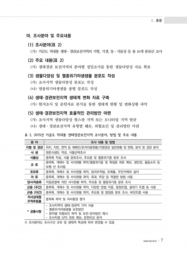 Ⅰ. 총괄 www.nie.re.kr ? 7 마. 조사분야 및 주요내용 1 조사분야 표 2 가 거금도 적대봉 생태·경관보전지역의 지형, 식생, 동·식물상 등 총 10개 분류군 조사 2 주요 내용 표 2 가 생태경관 보전지역의 분야별 정밀조사를 통한 생물다양성 자료 확보 3 생물다양성 및 멸종위기야생생물 분포도 작성 가 조사지역 생물다양성 분포도 작성 나 멸종위기야생생물 종별 분포도 작성 4 생태·경관보전지역 생태계 변화 자료 구축 가 현지조사 및 문헌자료 분석을 통한 생태계 현황 및 변화상황 파악 5 생태·경관보전지역 효율적인 관리방안 마련 가 조사지역 생물다양성 핫스팟 지역 또는 모니터링 지역 발굴 나 생태·경관보전지역 유형별 훼손, 위협요인 및 관리방안 마련 분 야 조사 내용 및 방법 지형 및 경관 위치,...
