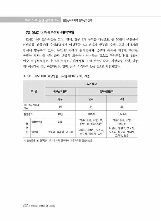 2016 DMZ 일원 생태계 조사 민통선이북지역 동부산악권역 222 ? National Institute of Ecology 3 DMZ 내부 동부산악·해안권역 DMZ 내부 조사지점은 고성, 인제, 양구 3개 구역을 대상으로 총 50대의 무인센서 카메라를 관할부대 수색대대에서 야생동물 모니터링과 군부대 수색지역의 사각지대 감시에 병용하고 있다. 무인센서카메라 촬영결과와 군부대 측에서 제공한 자료를 종합한 결과, 총 4목 10과 15종의 포유류가 서식하는 것으로 확인되었다 표 136 이중 법정보호종은 총 6종 멸종위기야생생물 Ⅰ급 반달가슴곰, 사향노루, 산양, 멸종 위기야생생물 Ⅱ급 하늘다람쥐, 담비, 삵 이 서식하고 있는 것으로 확인되었다. 구 분 DMZ 내부 동부산악권역 동부해안권역 양구 인제 고성 무인센서...