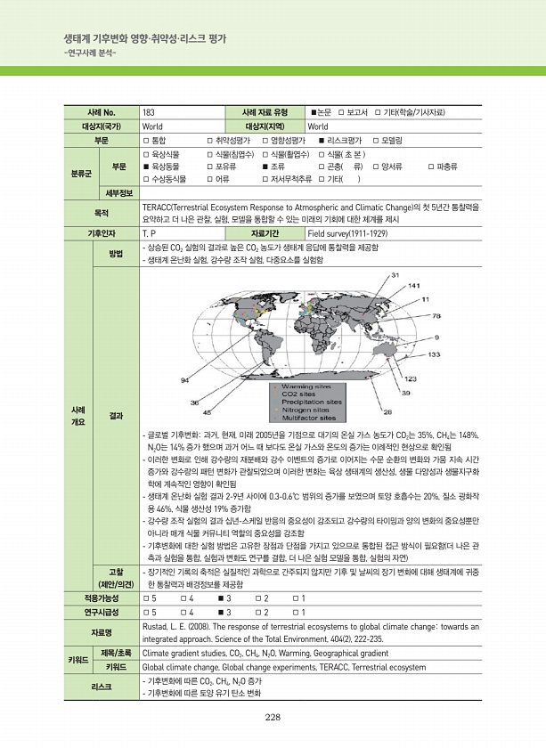 228 생태계 기후변화 영향·취약성·리스크 평가 -연구사례 분석- 사례 No. 183 사례 자료 유형 ■논문 □ 보고서 □ 기타 학술/기사자료 대상지 국가 World 대상지 지역 World 부문 □ 통합 □ 취약성평가 □ 영향성평가 ■ 리스크평가 □ 모델링 분류군 부문 □ 육상식물 □ 식물 침엽수 □ 식물 활엽수 □ 식물 초 본 ■ 육상동물 □ 포유류 ■ 조류 □ 곤충 류 □ 양서류 □ 파충류 □ 수상동식물 □ 어류 □ 저서무척추류 □ 기타 세부정보 목적 TERACC Terrestrial Ecosystem Response to Atmospheric and Climatic Change 의 첫 5년간 통찰력을 요약하고 더 나은 관찰, 실험, 모델을 통합할 수 있는 미래의 기회에 대한 체계를 제시 기후인자 T, ...