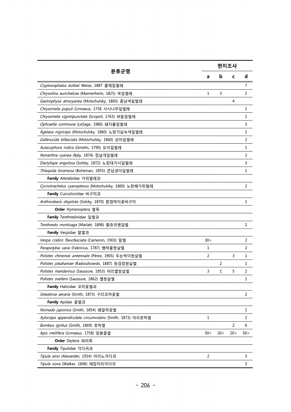 206 분류군명 현지조사 a b c d Cryptocephalus koltzei Weise, 1887 콜체잎벌레 7 Chrysolina aurichalcea Mannerheim, 1825 쑥잎벌레 1 3 2 Gastrophysa atrocyanea Motschulsky, 1860 좀남색잎벌레 4 Chrysomela populi Linnaeus, 1758 사시나무잎벌레 1 Chrysomela vigintipunctata Scopoli, 1763 버들잎벌레 1 Ophraella communa LeSage, 1986 돼지풀잎벌레 3 Agelasa nigriceps Motschulsky, 1860 노랑가슴녹색잎벌레 1 Gallerucida bifasciata...