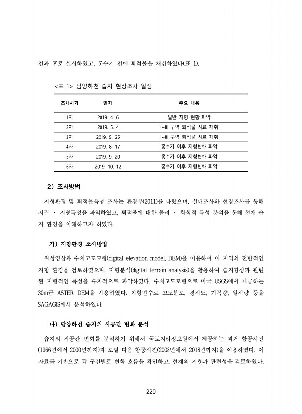 220 전과 후로 실시하였고, 홍수기 전에 퇴적물을 채취하였다 표 1 조사시기 일자 주요 내용 1차 2019. 4. 6 일반 지형 현황 파악 2차 2019. 5. 4 IIII 구역 퇴적물 시료 채취 3차 2019. 5. 25 IIII 구역 퇴적물 시료 채취 4차 2019. 8. 17 홍수기 이후 지형변화 파악 5차 2019. 9. 20 홍수기 이후 지형변화 파악 6차 2019. 10. 12 홍수기 이후 지형변화 파악 표 1 담양하천 습지 현장조사 일정 2 조사방법 지형환경 및 퇴적물특성 조사는 환경부 2011 를 따랐으며, 실내조사와 현장조사를 통해 지질 · 지형특성을 파악하였고, 퇴적물에 대한 물리 · 화학적 특성 분석을 통해 현재 습 지 환경을 이해하고자 하였다. 가 지형환경 조사방법 위성영상과 수치고도...