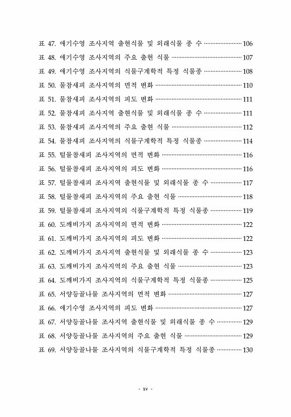 xv 표 47. 애기수영 조사지역 출현식물 및 외래식물 종 수 ······················· 106 표 48. 애기수영 조사지역의 주요 출현 식물 ··········································· 107 표 49. 애기수영 조사지역의 식물구계학적 특정 식물종 ······················· 108 표 50. 물참새피 조사지역의 면적 변화 ·····················································110 표 51. 물참새피 조사지역의 피도 변화 ·····················································111 표 52. 물참새피 조사지역 출현식물 및 외래식물 종 수 ············...
