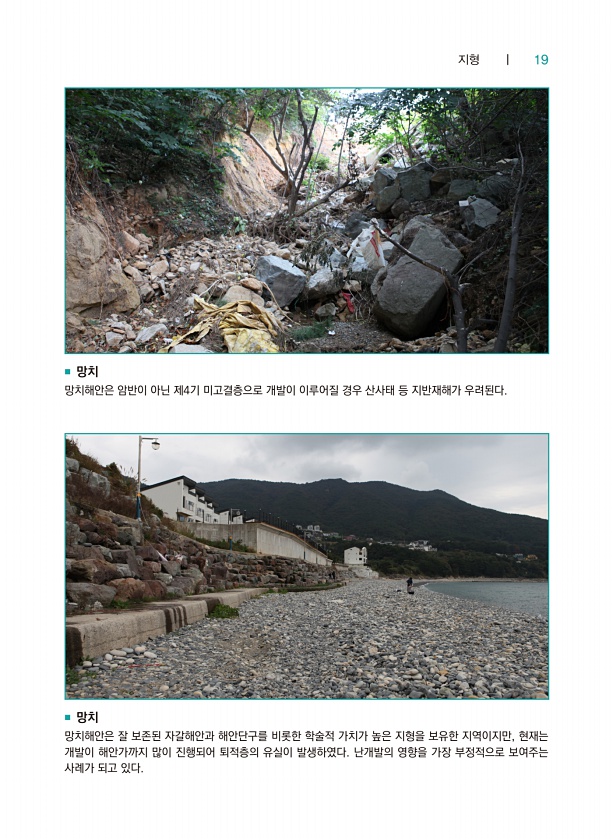 지형 ┃ 19 ■ 망치 망치해안은 암반이 아닌 제4기 미고결층으로 개발이 이루어질 경우 산사태 등 지반재해가 우려된다. ■ 망치 망치해안은 잘 보존된 자갈해안과 해안단구를 비롯한 학술적 가치가 높은 지형을 보유한 지역이지만, 현재는 개발이 해안가까지 많이 진행되어 퇴적층의 유실이 발생하였다. 난개발의 영향을 가장 부정적으로 보여주는 사례가 되고있다.
