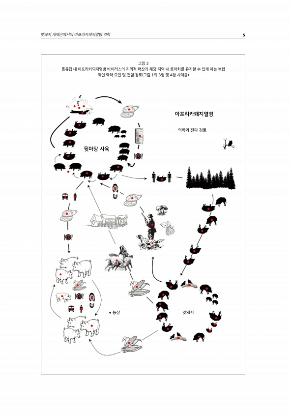 멧돼지 개체군에서의 아프리카돼지열병 역학 5 그림 2 동유럽 내 아프리카돼지열병 바이러스의 지리적 확산과 해당 지역 내 토착화를 유지할 수 있게 하는 복합 적인 역학 요인 및 전염 경로 그림 1의 3형 및 4형 사이클 아프리카돼지열병 뒷마당 사육 농장 멧돼지 역학과 전파경로