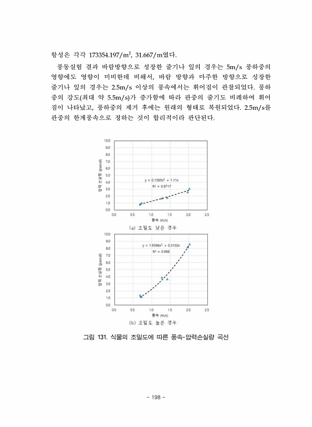 항성은 각각 173354.197/m2, 31.667/m였다. 풍동실험 결과 바람방향으로 성장한 줄기나 잎의 경우는 5m/s 풍하중의 영향에도 영향이 미비한데 비해서, 바람 방향과 마주한 방향으로 성장한 줄기나 잎의 경우는 2.5m/s 이상의 풍속에서는 휘어짐이 관찰되었다. 풍하 중의 강도 최대 약 5.5m/s 가 증가함에 따라 관중의 줄기도 비례하여 휘어 짐이 나타났고, 풍하중의 제거 후에는 원래의 형태로 복원되었다. 2.5m/s를 관중의 한계풍속으로 정하는 것이 합리적이라 판단된다. 그림 131. 식물의 조밀도에 따른 풍속-압력손실량 곡선 198