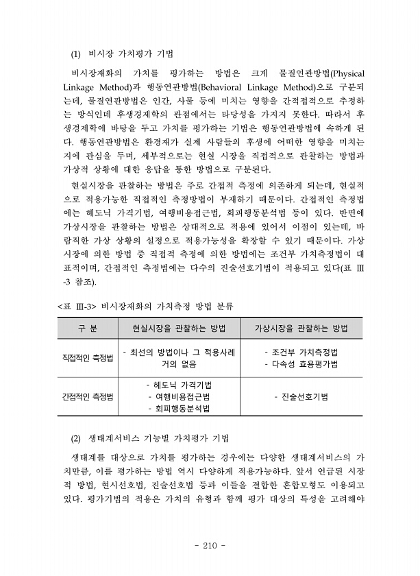 210 비시장 가치평가 기법 비시장재화의 가치를 평가하는 방법은 크게 물질연관방법 과 행동연관방법 으로 구분되 는데 물질연관방법은 인간 사물 등에 미치는 영향을 간적접적으로 추정하 는 방식인데 후생경제학의 관점에서는 타당성을 가지지 못한다 따라서 후 생경제학에 바탕을 두고 가치를 평가하는 기법은 행동연관방법에 속하게 된 다 행동연관방법은 환경재가 실제 사람들의 후생에 어떠한 영향을 미치는 지에 관심을 두며 세부적으로는 현실 시장을 직접적으로 관찰하는 방법과 가상적 상황에 대한 응답을 통한 방법으로 구분된다 현실시장을 관찰하는 방법은 주로 간접적 측정에 의존하게 되는데 현실적 으로 적용가능한 직접적인 측정방법이 부재하기 때문이다 간접적인 측정법 에는 헤도닉 가격기법 여행비용접근법 회피행동분석법 등이 있다 반면...