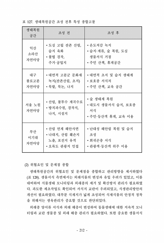 생태복원 공간 조성 전 조성 후 익산 소라산 자연마당 ?도심 고립 잔존 산림, 습지 육화 ?불법 경작, 주거·공업지 ?온도저감 녹지 ?습지·계류, 숲 복원, 도심 생물서식 거점 ?주민 산책, 휴게공간 대구 불로고분 자연마당 ?대면적 고분군 문화재 녹지 잔존산림, 초지 ?묵밭, 묵논, 나지 ?대면적 초지 및 습지 생태계 ?보호종 서식처 ?주민 산책, 교육 공간 서울 노원 자연마당 ?산림, 불투수 계곡수로 ?방치과수원, 경작지, 나지, 시설지 ?숲 생태계 복원 ?대도시 생물서식 습지, 보호종 서식 ?주민·등산객 휴게, 교육 이용 부산 이기대 자연마당 ?산림 연계 해안사면 ?나대지, 산림 훼손지 노출, 포진지 유적 ?오륙도 관광지 인접 ?난대성 해안림 복원 및 습지 조성 ?희귀곤충 서식 ?관광객·등산객 위주 이용...