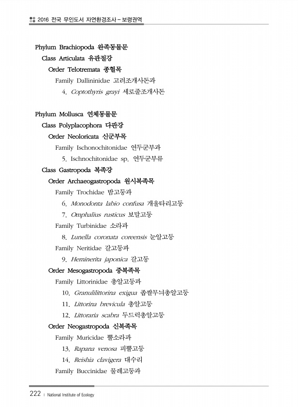 2016 전국 무인도서 자연환경조사 보령권역 222 ? National Institute of Ecology Phylum Brachiopoda 완족동물문 Class Articulata 유관절강 Order Telotremata 종혈목 Family Dallininidae 고려조개사돈과 4. Coptothyris grayi 세로줄조개사돈 Phylum Mollusca 연체동물문 Class Polyplacophora 다판강 Order Neoloricata 신군부목 Family Ischonochitonidae 연두군부과 5. Ischnochitonidae sp. 연두군부류 Class Gastropoda 복족강 Order Archaeogastropoda 원시복족목 Family Trochidae 밤고둥과 6. Monodo...
