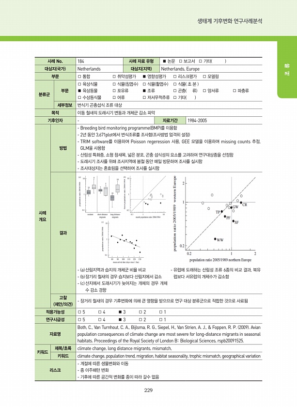 229 생태계 기후변화 연구사례분석 조 류 사례 No. 184 사례 자료 유형 ■ 논문 □ 보고서 □ 기타 대상지 국가 Netherlands 대상지 지역 Netherlands, Europe 부문 □ 통합 □ 취약성평가 ■ 영향성평가 □ 리스크평가 □ 모델링 분류군 부문 □ 육상식물 □ 식물 침엽수 □ 식물 활엽수 □ 식물 초 본 ■ 육상동물 □ 포유류 ■ 조류 □ 곤충 류 □ 양서류 □ 파충류 □ 수상동식물 □ 어류 □ 저서무척추류 □ 기타 세부정보 번식기 곤충섭식 조류 대상 목적 이동 철새의 도래시기 변동과 개체군 감소 파악 기후인자 자료기간 1984-2005 사례 개요 방법 Breeding bird monitoring programme BMP 를 이용함 2년 동안 3,671plot에서 번식조류를 조사함 ...