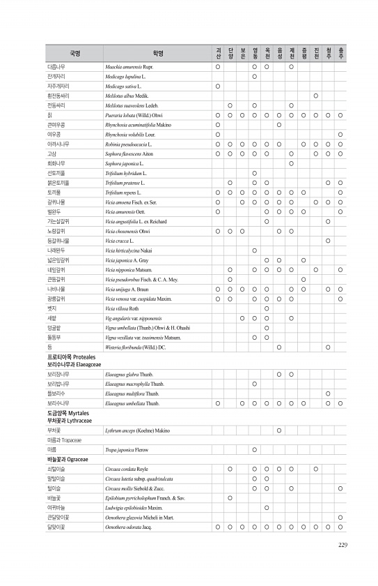 229 다릅나무 Maackia amurensis Rupr. ○ ○ ○ ○ 잔개자리 Medicago lupulina L. ○ 자주개자리 Medicago sativa L. ○ 흰전동싸리 Melilotus albus Medik. ○ 전동싸리 Melilotus suaveolens Ledeb. ○ ○ ○ 칡 Pueraria lobata Willd. Ohwi ○ ○ ○ ○ ○ ○ ○ ○ ○ ○ ○ 큰여우콩 Rhynchosia acuminatifolia Makino ○ ○ 여우콩 Rhynchosia volubilis Lour. ○ ○ 아까시나무 Robinia pseudoacacia L. ○ ○ ○ ○ ○ ○ ○ ○ ○ ○ 고삼 Sophora favescens Aiton ○ ○ ○ ○ ○ ○ ○ ○ ○ 회화나무 Sopho...