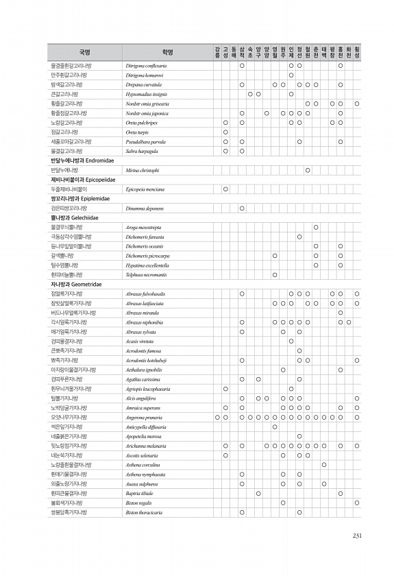 231 물결줄흰갈고리나방 Ditrigona confexaria ○ ○ ○ ○ 만주흰갈고리나방 Ditrigona komarovi ○ 밤색갈고리나방 Drepana curvatula ○ ○ ○ ○ ○ ○ ○ 큰갈고리나방 Hypsomadius insignis ○ ○ ○ 횡줄갈고리나방 Nordstr omia grisearia ○ ○ ○ ○ ○ 황줄점갈고리나방 Nordstr omia japonica ○ ○ ○ ○ ○ ○ ○ 노랑갈고리나방 Oreta pulchripes ○ ○ ○ ○ ○ ○ 점갈고리나방 Oreta turpis ○ 세줄꼬마갈고리나방 Pseudalbara parvula ○ ○ ○ ○ 물결갈고리나방 Sabra harpagula ○ ○ 반달누에나방과 Endromidae 반달누에나방 Mirina christoph...