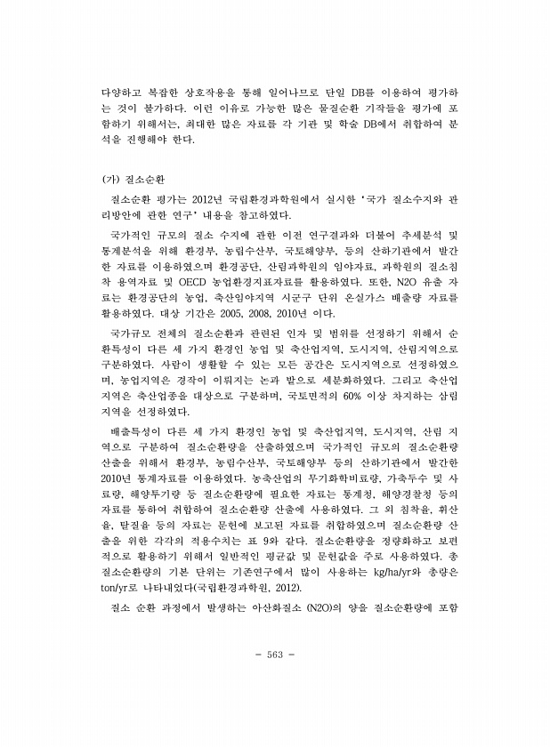 563 다양하고 복잡한 상호작용을 통해 일어나므로 단일 DB를 이용하여 평가하 는 것이 불가하다. 이런 이유로 가능한 많은 물질순환 기작들을 평가에 포 함하기 위해서는, 최대한 많은 자료를 각 기관 및 학술 DB에서 취합하여 분 석을 진행해야 한다. 가 질소순환 질소순환 평가는 2012년 국립환경과학원에서 실시한‘국가 질소수지와 관 리방안에 관한 연구’내용을 참고하였다. 국가적인 규모의 질소 수지에 관한 이전 연구결과와 더불어 추세분석 및 통계분석을 위해 환경부, 농립수산부, 국토해양부, 등의 산하기관에서 발간 한 자료를 이용하였으며 환경공단, 산림과학원의 임야자료, 과학원의 질소침 착 용역자료 및 OECD 농업환경지표자료를 활용하였다. 또한, N2O 유출 자 료는 환경공단의 농업, 축산임야지역 시군구 단위...