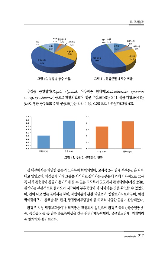 II. 조사결과 www.nie.re.kr ?217 바퀴목 4.7% 풀잠자리목 2.3% 메뚜기목 4.7% 노린재목 23.3% 딱정벌레목 51.2% 벌목 2.3% 나비목 11.6% 바퀴목 11.8% 풀잠자리목 1.0% 메뚜기목 5.9% 노린재목 딱정벌레목 23.5% 51.0% 벌목 1.0% 나비목 5.9% 그림 40. 분류별 종수 비율. 그림 41. 분류군별 개체수 비율. 우점종 콩잎벌레 Pagria signata , 아우점종 흰개미 Reticulitermes speratus subsp. kyushuensis 등으로 확인되었으며, 평균 우점도 DI 는 0.41, 평균 다양도 H는 3.48, 평균 풍부도 R1 및 균등도 J는 각각 4.29, 0.88 으로 나타났다 그림 42 0.0 0.1 0.2 0.3 0.4 0...
