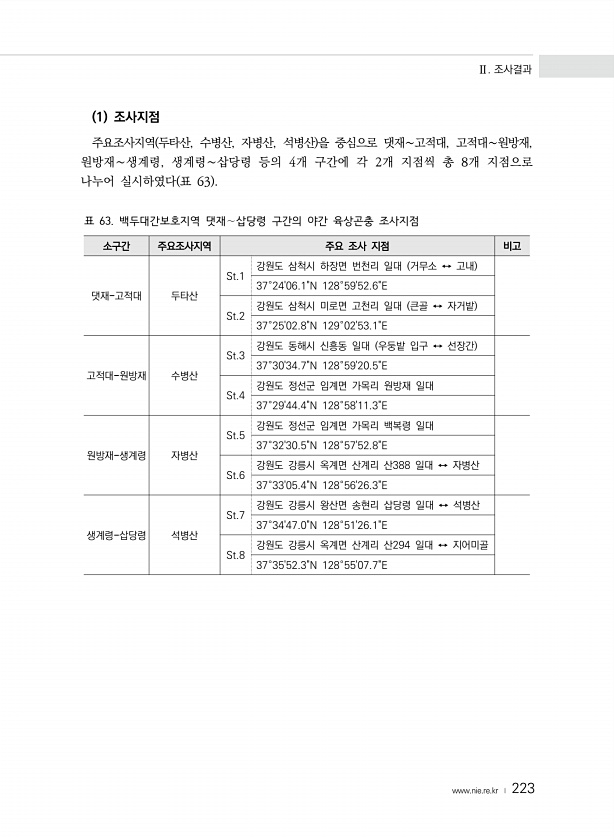 Ⅱ. 조사결과 www.nie.re.kr ? 223 1 조사지점 주요조사지역 두타산, 수병산, 자병산, 석병산 을 중심으로 댓재∼고적대, 고적대∼원방재, 원방재∼생계령, 생계령∼삽당령 등의 4개 구간에 각 2개 지점씩 총 8개 지점으로 나누어 실시하였다 표 63 소구간 주요조사지역 주요 조사 지점 비고 댓재-고적대 두타산 St.1 강원도 삼척시 하장면 번천리 일대 거무소 ↔ 고내 37°2406.1N 128°5952.6E St.2 강원도 삼척시 미로면 고천리 일대 큰골 ↔ 자거밭 37°2502.8N 129°0253.1E 고적대-원방재 수병산 St.3 강원도 동해시 신흥동 일대 우둥밭 입구 ↔ 선장간 37°3034.7N 128°5920.5E St.4 강원도 정선군 임계면 가목리 원방재 일대 37°2944.4N 1...