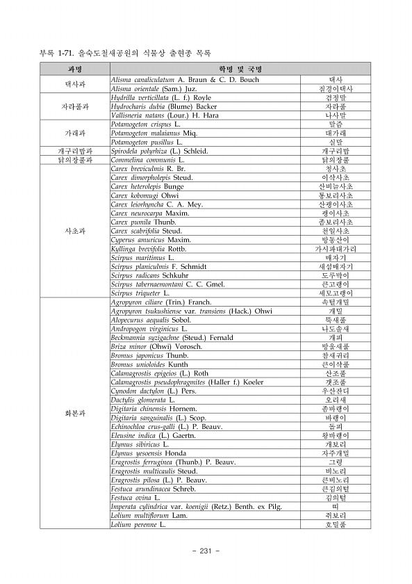 III. 조사결과 www.nie.re.kr ?221 번호 학명 국명 해빈 배후습지 배후농경지 배후삼림 비고 68 Rubus parvifolius L. 멍석딸기 ● Family Fabaceae 콩과 69 Albizia julibrissin Durazz. 자귀나무 ● 70 Amorpha fruticosa L. 족제비싸리 ● ● 외 71 Dunbaria villosa Thunb. Makino 여우팥 ● 72 Glycine soja Siebold & Zucc. 돌콩 ● 73 Indigofera kirilowii Maxim. ex Palib. 땅비싸리 ● 74 Kummerowia striata Thunb. Schindl. 매듭풀 ● 75 Lathyrus japonicus Willd. 갯완두 ● ● 사구 76 Lesp...