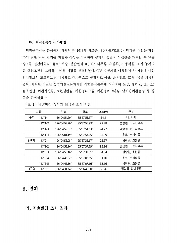 221 다 퇴적물특성 조사방법 퇴적물특성을 분석하기 위해서 총 10개의 시료를 채취하였다 표 2 퇴적물 특성을 확인 하기 위한 시료 채취는 지형과 식생을 고려하여 습지의 공간적 이질성을 대표할 수 있는 장소를 선정하였다. 유로, 하상, 범람원과 바, 버드나무류, 초본류, 수생식물, 과거 농경지 등 환경조건을 고려하여 채취 지점을 선택하였다. GPS 수신기를 이용하여 각 지점에 대한 위치정보와 고도정보를 기록하고 추가적으로 현장정보 식생, 습윤정도, 토색 등 를 기록하 였다. 채취된 시료는 농업기술실용화재단 시험분석본부에 의뢰하여 토성, 유기물, pH, EC, 유효인산, 치환성칼륨, 치환성칼슘, 치환성나트륨, 치환성마그네슘, 양이온치환용량 등 항 목을 분석하였다. 지점 위도 경도 고도 m 구분 I구역 DY1-...